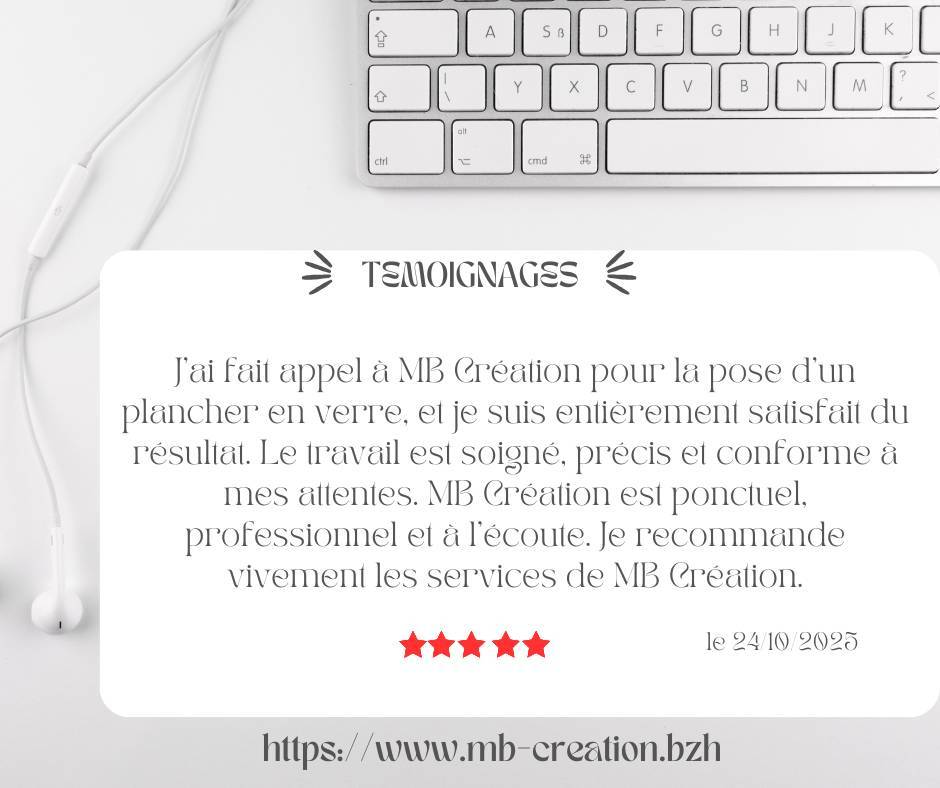 "J’ai fait appel à MB Création pour la pose d’un plancher en verre, et je suis entièrement satisfait du résultat. Le travail est..."